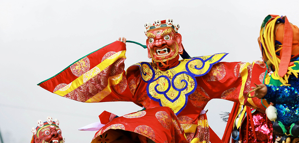 [Thimphu] Festival Visit Thimphu festival, which is held in the courtyard of the Tashichho Dzong. This is the main Secretariat Building, where the Government ministries, the office of His Majesty the King, the throne room, and the living quarters of the monk body and its Chief Abbot are housed. You will see locals dressed in their finest clothes who have walked from miles around to attend the festivities. They come to watch masked dances, to pray, and to feast. While the underlying purpose of the festival is spiritual, dances are more often like plays, telling stories where good triumphs over evil, or depicting significant historical events, especially surrounding the life of Bhutan’s patron saint, Padmasambhava (also known as Guru Rinpoche). There is inevitably a great deal of socialising as well. The occasion provides an opportunity for people to relax and forget the daily routine, and to dress in their finest clothes and jewellery, but it is also an occasion for prayer and blessings. Overnight at hotel in Thimphu